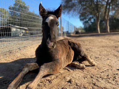 They call me Tink around here. I'm very shy, but I LOVE COOKIES. I was sold at auction to a kill buyer feed lot in Texas. When I arrived home, I was very thin, sick and had almost no mane and tail. I don't like to be handled by humans much, but every day I start to trust a little more. Mom tells me I'm due to have a baby in the next couple of months.