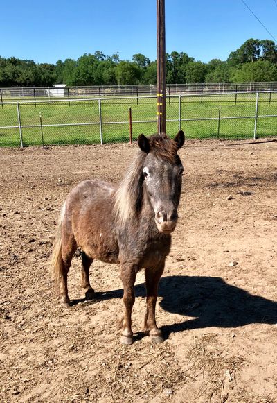 Bear is his name because he's soft & furry just like a teddy bear. One of the kindest souls we have on the ranch! Bear was sold at auction to a kill buyer and feed lot, out of Bowie, TX. He was a Rancher's horse and believed to be about 17 years of age. Bear struggles with chronic discomfort in his hoofs because his feet were not properly cared for. We're constantly battling thrush infections and cracking/softening of the heel bulbs. Despite these struggles, Bear is a happy camper and we spoil him with love every day!